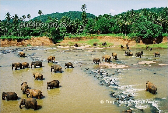 Sloní řeka u sloního sirotčince v Pinnawale. Sloni si ve špinavých vodách řeky zjevně lebedí a někteří se snaží získat volnost na druhém břehu. Rychlí mahauti aneb sloní pečovatelé je však ihned zahání zpět do vodního toku. Srí Lanka.