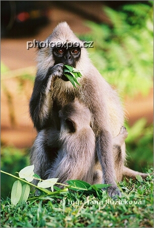 Hulman posvátný v celé své elegantní a důstojné božské kráse. Pro méně pozorné - na fotografii je dospělý jedinec, kterému se na těle drží mládě tváří otočené od objektivu. Srí Lanka.