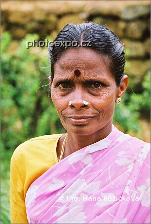 Naší poslední zastávkou před vysokohorským městečkem Nuwara Eliya je drobná domorodá vesnička na vysočině. Mou pozornost poutá svým zajímavým a zvlášní krásu vyzařujícím vzezřením kolemjdoucí žena. Přes drobné zábrany mi dovoluje pořídit dva snímky. Na tomto druhém se jí z poněkud zamračeného výrazu obličeje vynořuje drobný úsměv. Srí Lanka.