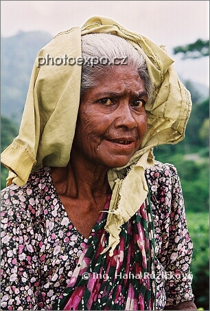 Stařena na čajové plantáži v oblasti Nuwara Eliya, Srí Lanka.