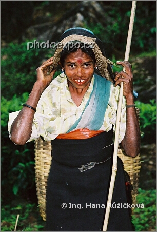 Tamilská sběračka čaje v typickém pracovním oděvu. Oblast Nuwara Eliya, Srí Lanka.