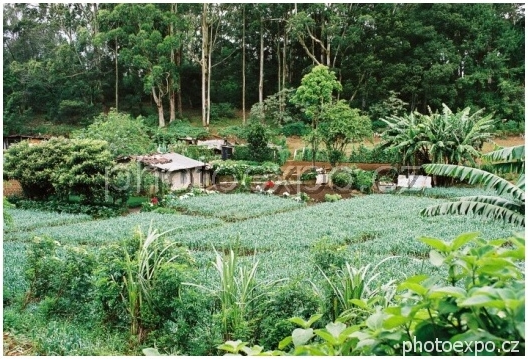 Před naším hotelem Forest Lodge nedaleko městečka Nuwara Eliya se rozprostírají domorodá políčka pečlivě obdělávaná místními lidmi. U políček stojí i drobné chatrče postavené ze všeho možného a sloužící jako obydlí majitelům políček.