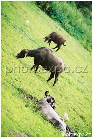 Vodní buvoli jsou zde často vyskytujícím se hospodářským zvířetem, pro Čecha velmi netradičním. Společnost jim dělají ptáci, jejichž jméno je mi neznámé.