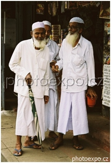 Tři staříci v typickém bílém oděvu - poněkud adrenalinový snímek z hlavního města Colomba.