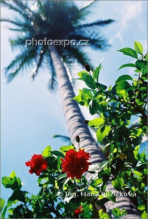 Ibiškový květ pár centimetrů nad zemí pod vysokou palmou mne inspiroval k této fotografii. Abych snímek pořídila, musela jsem si lehnout na suchý palmový list pod ibišek. Mé pozadí to odneslo lehkým odřením, ale myslím, že to stálo za to. Ko Samui, Thajsko.