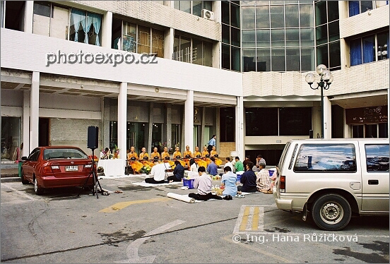 Buddhistická seance uprostřed parkoviště v Bangkoku, Thajsko.