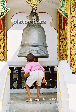 Copak to tu máme? Malého chlapce zjevně zaujal velký zvon v nádherném chrámovém komplexu severního Thajska Wat Phra That Doi Suthep.