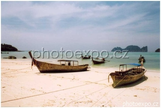 Long Beach na ostrově Phi Phi (Ko Phi Phi Don). Typické loďky tzv. longtail boats jsou provazy nataženými napříč pláží pečlivě uvázané u stromů.