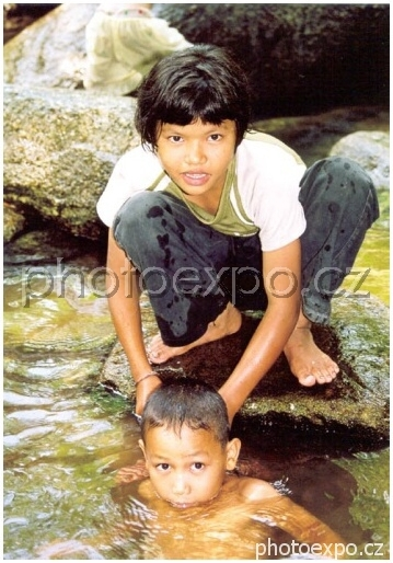 Děti ve vodopádech Hin Lad na ostrově Ko Samui. V tomto věku ještě dívka může dominovat nad chlapcem. Ve věku dospělém se jí to v této zemi asi dařit nebude.
