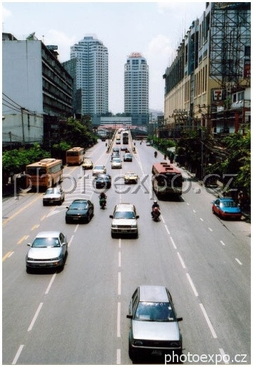 Thajsko moderní. Několikraproudová silnice v centru Bangkoku. Přejít ji lze pouze po mostu.