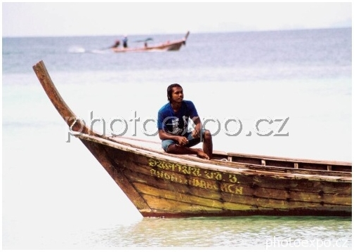 Mladý domorodec na své loďce u romantické pláže Ao Loh Moodli na ostrově Phi Phi aneb Ko Phi Phi Don. Mladík na mne celou dobu mával a upozorňoval na sebe, jakmile jsem na něj namířila objektiv, začal přestírat nezájem.