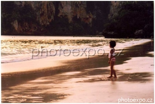 Dítě a západ slunce na West Railay. Jižní Thajsko, Andamanské moře.