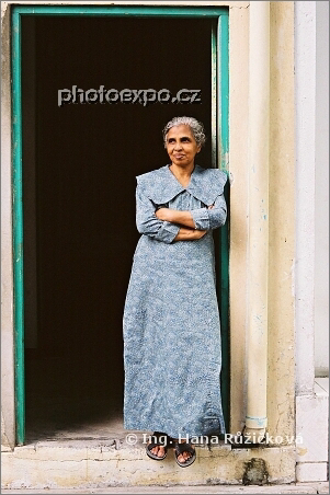 Dáma na zápraží svého domu v hlavním městě Malediv Male. Její úsměv prozrazuje, že o mém, na ni namířeném objektivu, moc dobře ví.