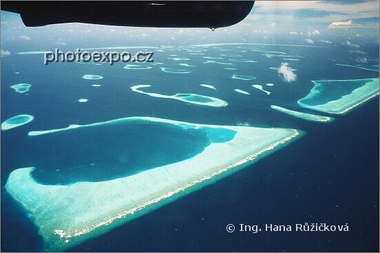 Let hydroplánem nad maledivskými atoly v Indickém oceánu nabízí dech beroucí výhledy. Z výšky je patrné, že většina ostrovů vůbec nevyčnívá nad hladinu a z lodi bychom je neměli šanci vidět.