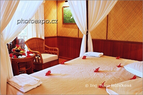 Květinami zdobená romantická postel v luxusním bungalovu na ostrově Baros, Maledivy.