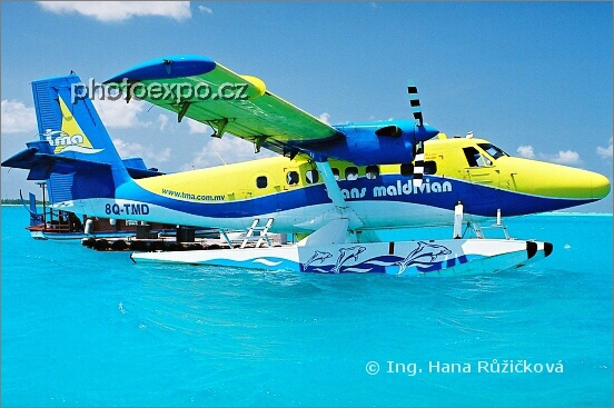 A toto je náš hydroplán, který právě přistál na volném moři u přistávací "mikroplošiny", aby vysadil zájemce o dovolenou na Holiday Island a nás nabral a přemístil na Paradise Island. "Letiště na vlnách". Nádhera. Maledivy