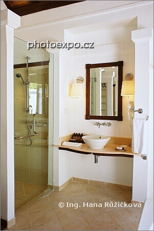 Interiér luxusní koupelny v bungalovu, který jsem na ostrově Kurumba měla jen pro sebe. Když jsem se chtěla umýt, měla jsem tři! možnosti (nepočítaje umyvadlo) - vykoupat se ve vaně, osprchovat se ve sprchovém koutě, nebo vyjít ven a užít si soukromou venkovní sprchu! Maledivy