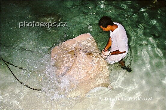 Večerní krmení rejnoků na Kuramathi. Po svém přídělu toužící zvířata s poměrně velkou agresivitou "najíždějí" na svého krmitele a bojují o sousto. Pro krmiče nikoli bezpečná hra. Maledivy
