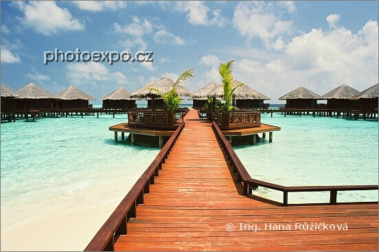 Dřevěná cesta vedoucí k vodním bungalovům na ostrově Baros. Maledivy