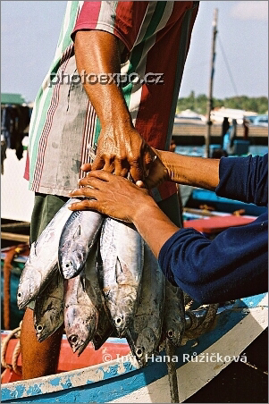 Čerstvý úlovek míří z rybářské lodi do rukou prodejců. Přístav v Male, Maledivy.
