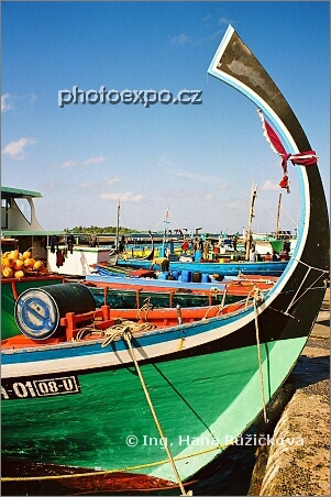 Rybářský přístav v Male, hlavním městě Malediv, je opravdu pestrý. Nechybí ani typické loďky s vysoko vytaženým kýlem.