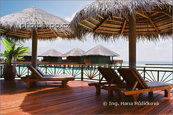 Maledivská moderní a luxusní architektura. Jen si pohovět ve stínu stylových slunečníků s výhledem na tyrkysově čirou vodu Indického oceánu...do ruky samozřejmě nějaký opojný drink. Baros, Maledivy.