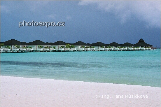 Temná obloha před bouřkou nad vodními bungalovy Paradise Islandu. Maledivy