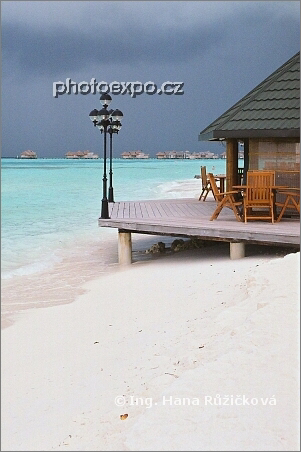 Paradise Island těsně před bouřkou. Následný déšť a hromobití mi poprvé po týdnu, kdy jsem vstávala každý den na fotografování východu slunce a přestávala pořizovat obrázky až po západu slunce, umožnily zasloužený odpolední odpočinek v měkoučké posteli luxusního bungalovu. Jak jsem padla, tak jsem usnula. Maledivy