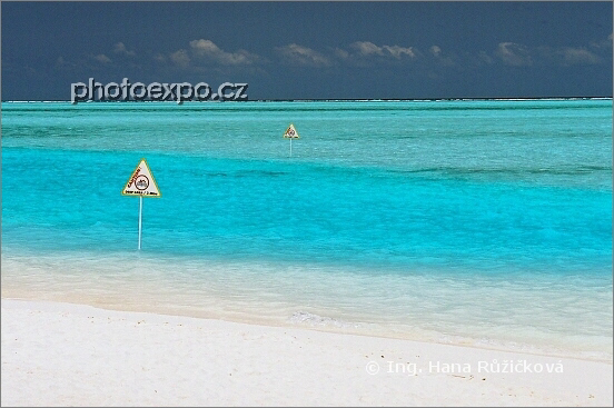 Pozor! Hloubka 3 m! Tedy asi šestinásobná proti normální hloubce moře kolem maledivských ostrovů - resortů. Konečně pořádné koupání! Sun Island, Maledivy.