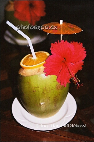 Uvítací nápoj v kokosovém ořechu na ostrově Baros. Maledivy