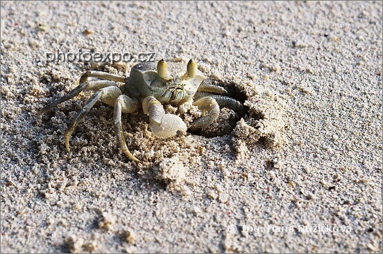 Maledivské pláže jsou nejen rájem turistů ale i krabíků. Většinou jsou mnohem rychlejší než fotograf, tento budovatel "svého doupěte" mi však neuniknul...