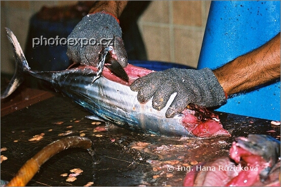 Přestože jsem vegetariánka, rybí trh v Male mne velmi zaujal. Ruce šikovných Maledivců tu neuvěřitelnou rychlostí čistí a vyvrhují čerstvě ulovené ryby. Vědomí mé fotografické přítomnosti vybičovalo rybího odborníka k ještě mnohem větší rychlosti zpracování úlovku, takže jsem musela volit velmi rychlý čas expozice :=) Male, Maledivy.