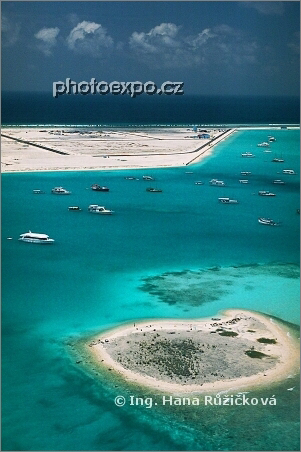 Maledivy z výšky... Let hydroplánem nám nabídnul nezapomenutelné pohledy na ostrůvky typicky obklopené tyrkysovou mělčinou, která se pak náhle propadá do moře. Zde po návštěvě Sun Islandu a Holiday Islandu přistáváme zpět u hlavního města Male, v pozadí přistávací ranvej pro normální letadla. Maledivy