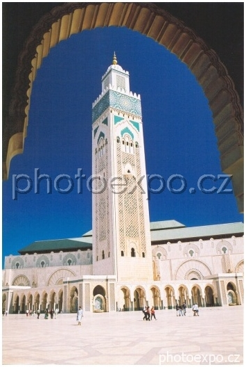 Detail největší marocké mešity Hassana II. v Casablance focený z podloubí přilehlých budov. Na rozlehlé prostranství se při obřadech vejdou údajně desítky tisíc lidí.
