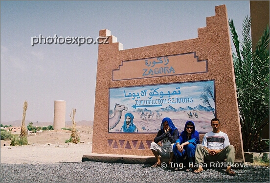 "52 dní do Timbuktu na hrbu velblouda... To myslíš vážně?" Tabule hlásající, že Timbuktu je 52 dní cesty na velbloudu, je umístěna v místě brány Sahary - Zagoře. Maroko.
