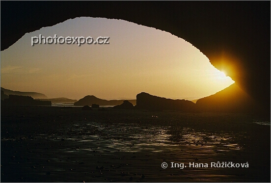 Magický západ slunce za písečným obloukem, pozoruhodným místem pláže Le Gzira. Maroko.