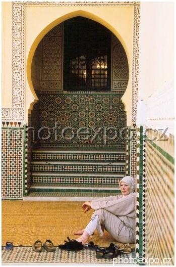 V Meknes navštěvujeme mešitu krále Meulaye Ismaila. Při odchodu z tohoto svatostánku mne zaujala Maročanka sedící u bot návštěvníků mešity. Dělám, že fotím jeden z vykládaných vchodů do mešity. Náš marocký průvodce mi však vzápětí kontruje, že jsem skutečně velmi nenápadná...