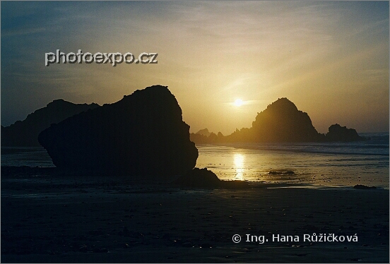 Západ slunce mezi skalami, nad Atlantikem. Le Gzira, Maroko.