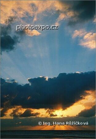 Kreativita slunce zapadajícího nad Atlantikem. Le Gzira, Maroko.