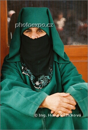 Přísně střežená tvář muslimské ženy v přístavním městě Essaouira, Maroko.