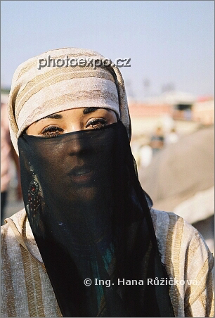 Tato dívka mne upoutala svou nádhernou tváří, jejíž krásu ještě podtrhával průsvitný černý závoj. Nabízela tetování hennou na marrakeshském hlavním náměstí Djemaa El Fna. A řekla si o rekordní bakšišné cca 60 Kč za fotografování. V Marrakeshi je tip za focení běžně dvojnásobný než jinde v Maroku.