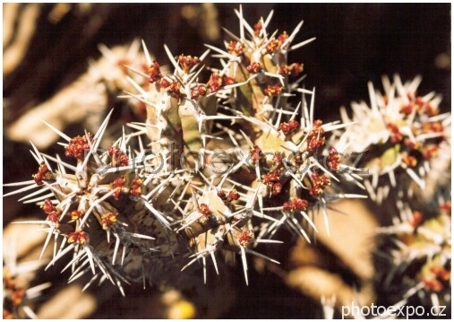Detail kaktusu kvetoucího drobnými kvítky uprostřed marocké přírody.