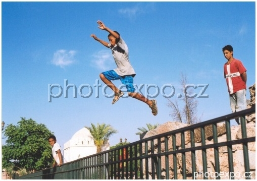 Skok jen pro mne. Marocký klučina mi předvádí své skokanské umění u mešity Kotoubia v pohádkové Marrakeshi.