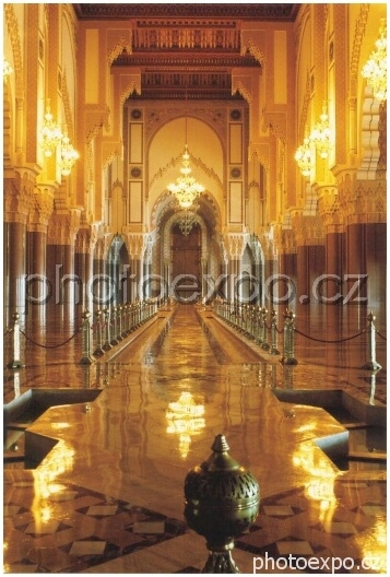 Překrásný interiér největší marocké mešity Hassana II. v Casablance. Plazím se tu se stativem po zemi a mé kalhoty suplují hadr na podlahu. Z výkladu nemám nic, jen svým fotoaparátem hltám tu nádheru.