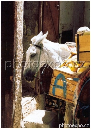 Oslíci jsou v Maroku oblíbeným dopravním prostředkem. Tomuto oslíku je právě nakládáno na hrb zboží v úzké uličce města Fés.