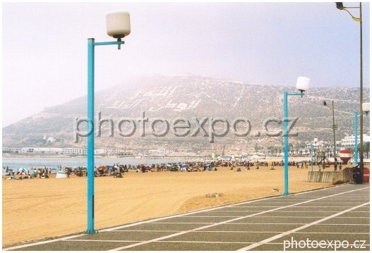 Gigantická a pro mne spíše odpudivá pláž v turistickém Agadiru. Nekoupala jsem se zde ani jednou. Zato záběry zde mohl člověk pořídit dost zajímavé... Vzadu na kopci nad Agadirem se rýsuje zde tradiční nápis: Bůh, vlast, král.