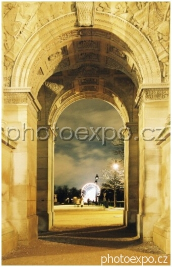 Průhled malým Vítězným obloukem z Place Du Carrousel na nasvícené točící se ruské kolo za zahradami des Tuileries. Za zády mám Louvre.