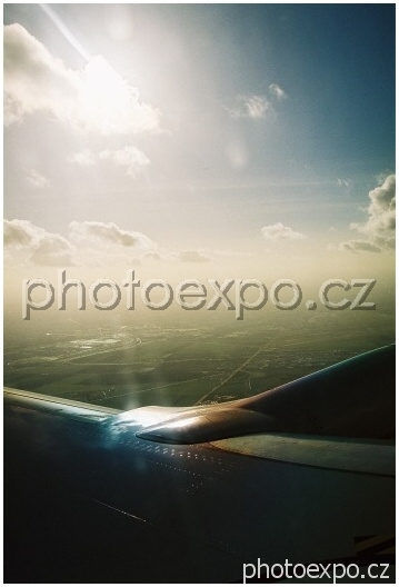 Světelný odraz na křídle letadla při letu z Paříže zpět do Prahy.
