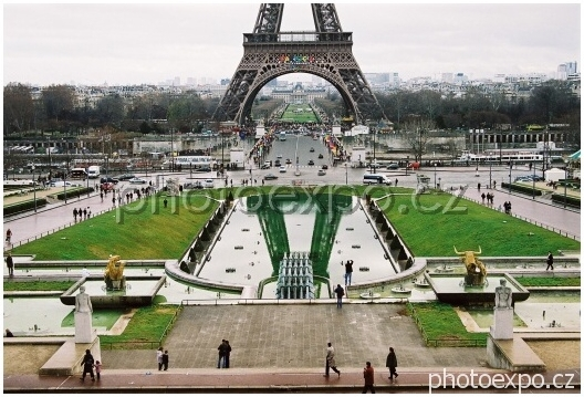 Výhled na zahrady Jardins de Trocadéro s bazénkem zrcadlícím pařížskou dominantu - Eiffelovu věž.