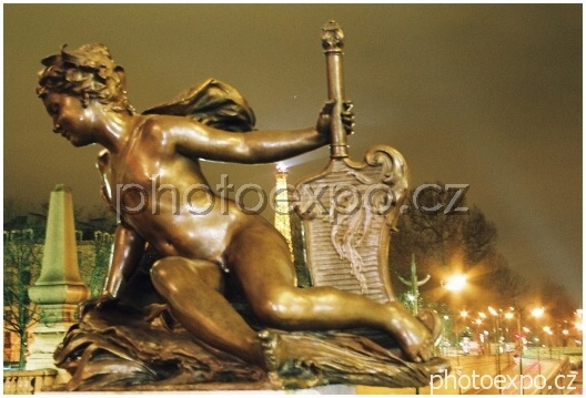 Socha na nejpřepychovějším mostě Paříže - mostě Alexandra III. Je po půlnoci a tedy již 31. prosince 2004, Silvestr.